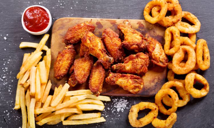 - Món chiên rán nhiều dầu mỡ: Gà rán, cá chiên, khoai tây chiên… chứa nhiều chất béo khó tiêu, dễ gây đầy hơi, trướng bụng và kích thích co thắt đại tràng. Đây là nhóm món ăn gây khó chịu nhiều nhất cho người bệnh.